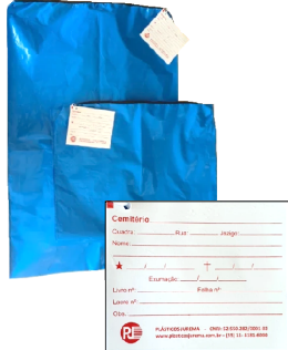 Saco plástico para exumação com etiqueta de identificação e zíper para fechamento.